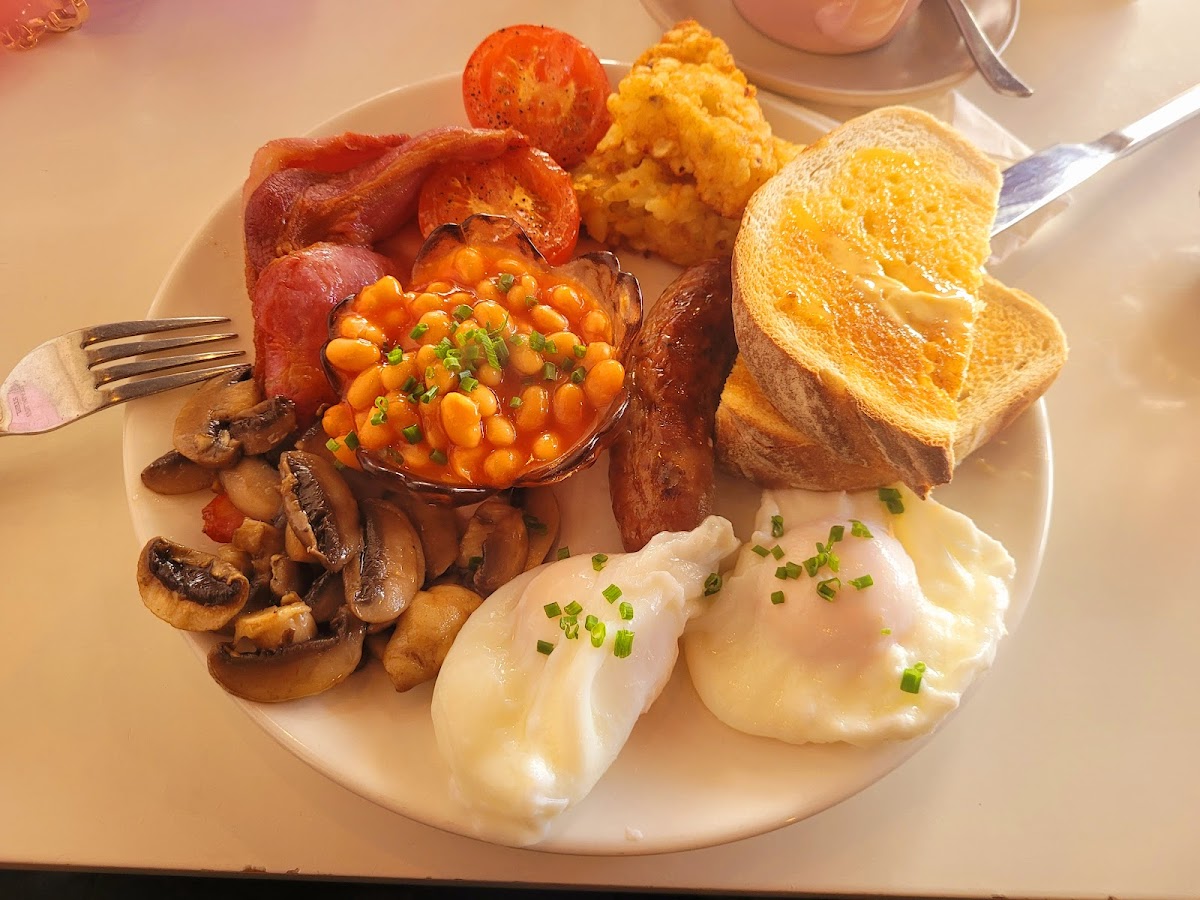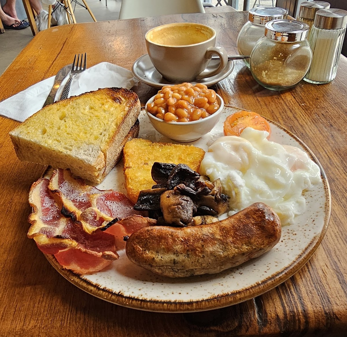 Such a nice breakfast, bacon cooked to perfection, sausages are super tasty, spot on poached egg, even the mushrooms and tomatoes were just right. Great service and a warm and inviting atmosphere too. I was near the till and while eating my breakfast at least 3 or more customers/pairs decided to have their order in rather than taking it away as originally ordered, so they obviously picked up on the inviting atmosphere too.